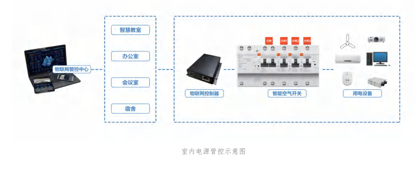 采用物联网技术,通过各级智能设备收集用电数据,实现能耗监测。同时可通过手机、电脑远程控制室内电源总闸开/关,远程一键断电、上电及 用电查询等,减轻管理人员的负担,实现校园用电管理的现代化,推动绿色校园节能建设。